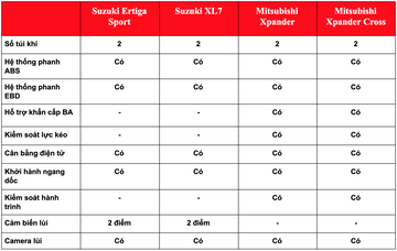 So sánh trang bị trên Suzuki Ertiga Sport, XL7, Mitsubishi Xpander và Xpander Cross