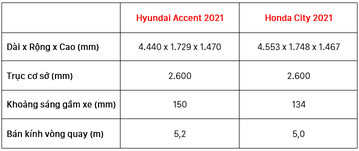 Có thể thấy, City dài và rộng hơn đáng kể so với Accent. Bán kính vòng quay nhỏ cũng giúp mẫu sedan Nhật có lợi thế tốt hơn khi cần xoay sở trong các khu vực chật hẹp. Tuy nhiên, Accent vẫn ghi điểm với chiều cao tổng thể lớn. Khoảng sáng gầm cao hơn cũng giúp Accent linh hoạt hơn khi cần leo qua các vỉa hè mấp mô.
