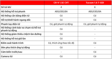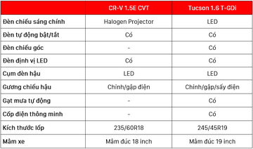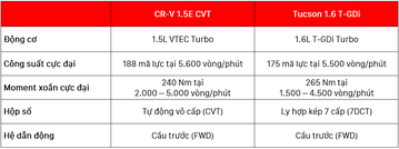 Về vận hành, động cơ 1.5L VTEC trên CR-V 1.5E CVT sở hữu công suất cực đại lớn hơn. Tuy nhiên, động cơ tăng áp trên Tucson 1.6 T-GDi lại có moment xoắn cao hơn từ những dải tua máy thấp hơn. Động cơ này kết hợp với hộp số ly hợp kép 7 cấp hứa hẹn sẽ mang đến trải nghiệm lái thể thao và mạnh mẽ cho mẫu crossover Hàn Quốc.