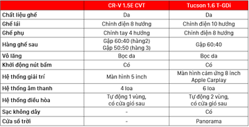 Về trang bị, Hyundai Tucson 1.6 T-GDi với ưu thế là phiên bản “full-option” nên hoàn toàn chiếm ưu thế so với Honda CR-V 1.5E CVT. Hai mẫu xe đều sở hữu những trang bị cần thiết trong tầm tiền như ghế lái chỉnh điện, khởi động nút bấm, điều hòa tự động.