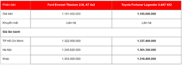 Với tiêu chí so sánh cùng giá bán, danhgiaXe chọn ra phiên bản Toyota Fortuner Legender 2.4AT 4X2 và Ford Everest Titanium 2.0L AT 4x2. Giá bán của xe như sau: