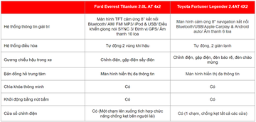 Danh sách trang bị tiện nghi - công nghệ & giải trí trên 2 đối thủ là không quá chênh lệch. Bảng so sánh thông số dưới đây cho thấy rõ điều đó: