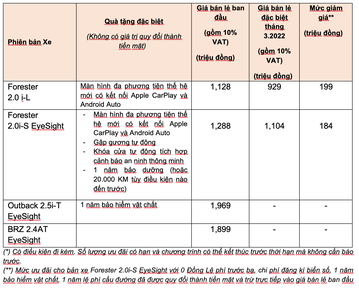 Không những vậy, khách hàng còn được nhận thêm nhiều ưu đãi hấp dẫn khác khi mua xe Subaru từ nay đến hết 31.03.2022. Chi tiết giá đặc biệt và ưu đãi* cho từng phiên bản xe Forester, xe Outback và xe BRZ như sau: