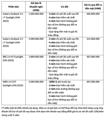 Chi tiết ưu đãi (*) cho từng phiên bản xe Forester như sau: