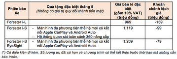 Chi tiết giá đặc biệt và ưu đãi* cho từng phiên bản của Subaru Forester như sau: