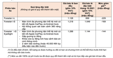 Ngoài chương trình Hỗ trợ 100% Lệ phí Trước bạ, khách hàng còn được nhận thêm nhiều ưu đãi hấp dẫn khác khi mua xe Subaru Forester từ nay đến hết 31.10.2021. Chi tiết giá đặc biệt và ưu đãi* cho từng phiên bản xe như sau: