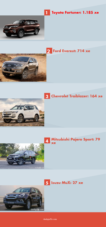 Toyota Fortuner chiếm giữ vị trí đầu bảng, tiếp đến là Ford Everest, Chevrolet Traiblazer...