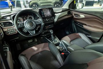 Bước vào bên trong, Fronx chào đón người lái bằng không gian ấn tượng và tinh tế. Sự kết hợp hài hòa hai tông màu đen và đỏ bordeaux mang lại chiều sâu và sự sang trọng cho khoang cabin, trong khi các chi tiết kim loại, ghế da pha nỉ và phần ốp cửa được trang trí bằng da tổng hợp tạo điểm nhấn cuốn hút, đồng thời mang lại cảm giác thân thiện, dễ chịu cho người dùng.