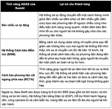 New Swift được trang bị hệ thống hỗ trợ lái xe an toàn Suzuki (ADAS), sở hữu nhiều tính năng hiện đại. Với cam kết về chất lượng Nhật Bản uy tín toàn cầu, mẫu xe được tăng cường trang bị lên đến 6 túi khí cùng nhiều công nghệ an toàn chủ động nhằm hỗ trợ tối đa cho người lái, qua đó thiết lập nên chuẩn mực mới về an toàn trong phân khúc xe đô thị, mang đến sự an tâm cho cả người lái lẫn hàng khách đi cùng.