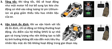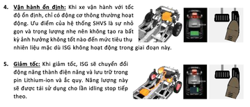ISG có chức năng chuyển đổi động năng thành điện năng thông qua hệ thống phanh tái sinh để tích trữ lại năng lượng cho pin và ắc quy khi xe giảm tốc. Ngoài ra ISG còn đóng vai trò như một mô tơ dẫn động để hỗ trợ, tiếp sức khi xe tái khởi động hoặc khi cần tăng tốc, lên dốc một cách mượt mà và nhẹ nhàng. Nhờ đó, hiệu quả nhiên liệu và hiệu suất vận hành của xe đều được cải thiện.