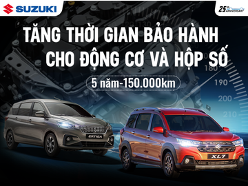 Việt Nam Suzuki chính thức thông báo tăng thời gian bảo hành cho động cơ và hộp số cho thế hệ mới nhất của 2 dòng xe Ertiga và XL7 lên 5 năm hoặc 150.000 km tùy điều kiện nào đến trước. Thay đổi này nhằm để khách hàng có thể an tâm hơn khi sử dụng xe Suzuki.