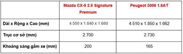 Các thông số về kích thước của 2 xe cho thấy Mazda CX-5 có phần nhỉnh hơn đôi chút vè tổng thể, tuy nhiên trục cơ sở của Peugeot 3008 lại dài hơn, mang lại lợi thế về khoảng để chân ở hàng ghế sau dư dả. Bù lại, Mazda CX-5 lại có thể điều chỉnh độ nghiêng ở hàng ghế thứ 2, đem đến cảm giác thoải mái hơn nếu phải đi xa.