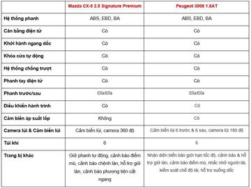 Cả Mazda CX-5 và Peugeot 3008 đều mang lại danh sách trang bị an toàn hiện đại như: cảnh báo điểm mù, cảnh báo chệch làn đường và hỗ trợ duy trì làn đường, phanh tay điện tử. Điểm khác là CX-5 trang bị tính năng cảnh báo xe cắt ngang khi lùi, camera 360 độ, trong khi 3008 trang bị thêm tính năng nhận diện biển báo giới hạn tốc độ, nhắc nhở tài xế, camera góc rộng 180 độ.