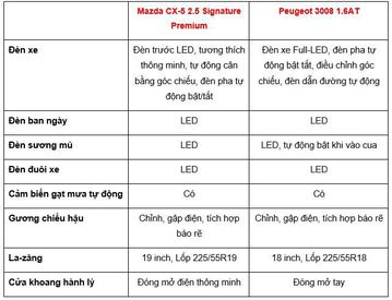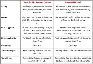 Với giá bán ngang ngửa, các trang bị tiện nghi, an toàn trên 2 mẫu SUV là một chín một mười. Tuy nhiên Mazda CX-5 sẽ phù hợp hơn với những người thích một chiếc SUV có thiết kế bóng bẩy, thể thao với khả năng vận hành mạnh mẽ, linh hoạt hơn trên mọi cung đường, đi kèm là dịch vụ hậu mãi dễ dàng với nhiều showroom trải rộng trên khắp dải đất chữ S.... thì Peugeot 3008 lại hướng đến nhóm khách hàng mong muốn tìm kiếm một chiếc xe đậm chất Pháp, sang trọng, lịch lãm với tiện nghi hiện đại, khả năng vận hành đầm chắc, cách âm tốt và có thiết kế khác biệt.