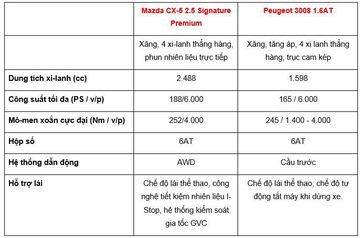 Mazda CX-5 bản cao cấp nhất trang bị động cơ 2.5L cho công suất mạnh hơn, kết hợp hệ dẫn động 4 bánh, mang lại khả năng vận hàng mạnh mẽ, linh hoạt trên nhiều cung đường. Trong khi đó Peugeot 3008 trang bị động cơ tăng áp 1.6L kết hợp hệ dẫn động cầu trước, cho công suất nhỏ hơn.