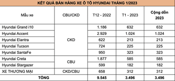 TC Group (Tập đoàn Thành Công) thông báo kết quả bán hàng tháng 1/2023. Theo đó, tổng doanh số xe Hyundai tháng 1 đạt 3.496 xe.