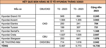 Tập đoàn Thành Công (TC GROUP) thông báo kết quả bán hàng tháng 3/2023. Theo đó, tổng doanh số xe Hyundai tháng 3 đạt 5.773 xe, tăng trưởng 5,5% so với tháng 2/2023.