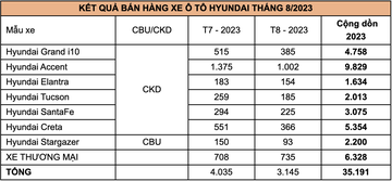 Doanh số bán hàng các mẫu xe Hyundai trong tháng 8/2023 (Đơn vị: Xe)