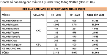 Hyundai Tucson đứng thứ 4 với số bán đạt 578 xe, tăng hơn gấp 3 lần tháng 8. Hyundai Santa Fe với 470 xe bán ra đứng ở vị trí thứ 5, tăng trưởng 108,8%. Hyundai Stargazer đứng ở vị trí thứ 6 với 400 xe. Hyundai Elantra khép lại tháng 9 với 281 xe, tăng trưởng 82,5%. Các mẫu xe thương mại Hyundai đạt doanh số 950 xe bán ra trong tháng 9/2023, tăng trưởng 29,3% so với tháng 8. Tính đến hết Quý III/2023, tổng số xe mang thương hiệu Hyundai bán ra trên toàn quốc đạt 41.168 xe.