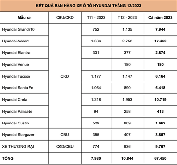 Tập đoàn Thành Công (TC GROUP) thông báo kết quả bán hàng tháng 12/2023. Theo đó, tổng số lượng xe Hyundai bán ra trên thị trường trong tháng đạt 10.884 chiếc, tăng trưởng 36,4% so với tháng 11, đồng thời đưa tổng số xe mang thương hiệu Hyundai bán ra trong năm 2023 đạt 67.450 xe.