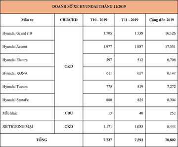 Tiếp tục là mẫu xe bán chạy nhất của TC MOTOR, tháng 11 đã có 1,987 xe Accent đến tay khách hàng, đạt 17,551 xe cộng dồn trong 11 tháng. Giữ vững vị trí thứ 2 là mẫu xe Grand i10 với 1,739 xe, cộng dồn 11 tháng đạt 16,126 xe.