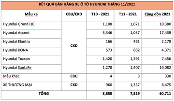 Hyundai Elantra và KONA chứng kiến sự tăng trưởng vượt bậc so với tháng 10, với con số tăng trưởng của Elantra đạt 177%, tương ứng 461 xe & KONA đạt 53%, tương ứng 882 xe. Hyundai Accent với số bán ra tháng 11 đạt 1.057 xe giúp tổng doanh số trong năm 2021 đạt 17.439 xe, giữ vững vị trí số 1 về doanh số bán của Hyundai trong năm 2021.