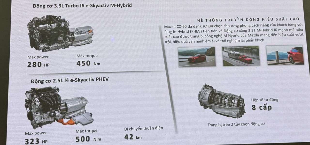CX-60 và CX-90 trang bị động cơ SkyActiv 3.3 Turbo MHEV và 2.5 PHEV, dẫn động 4 bánh toàn thời gian (AWD), ưu tiên dẫn động cầu sau, cùng hệ thống treo tiên tiến, mang lại khả năng vận hành linh hoạt và ổn định trên mọi địa hình, công nghệ an toàn i-Activsense tiên tiến, xe đạt chuẩn 5 sao toàn cầu.