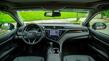 Bên trong, Toyota Camry 2019 tiếp tục sự phá cách với bảng táp-lô bất đối xứng, nhưng hài hòa với các chất liệu ốp trang trí nội thất. Các công nghệ mới giúp nâng cấp vị thế của Toyota Camry như màn hình HUD màu, màn hình đa thông tin MID 7 inch, màn hình giải trí trung tâm, hệ thống định vị dẫn đường hay hệ thống phanh tay điện tử kết hợp chức năng giữ phanh tự động.