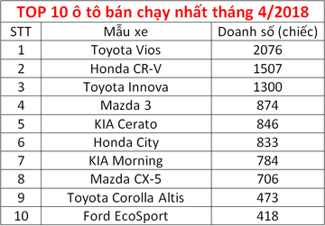 - TOP 10 ô tô bán chạy nhất tháng 4/2018: doanh số Honda CR-V gấp đôi Mazda CX-5