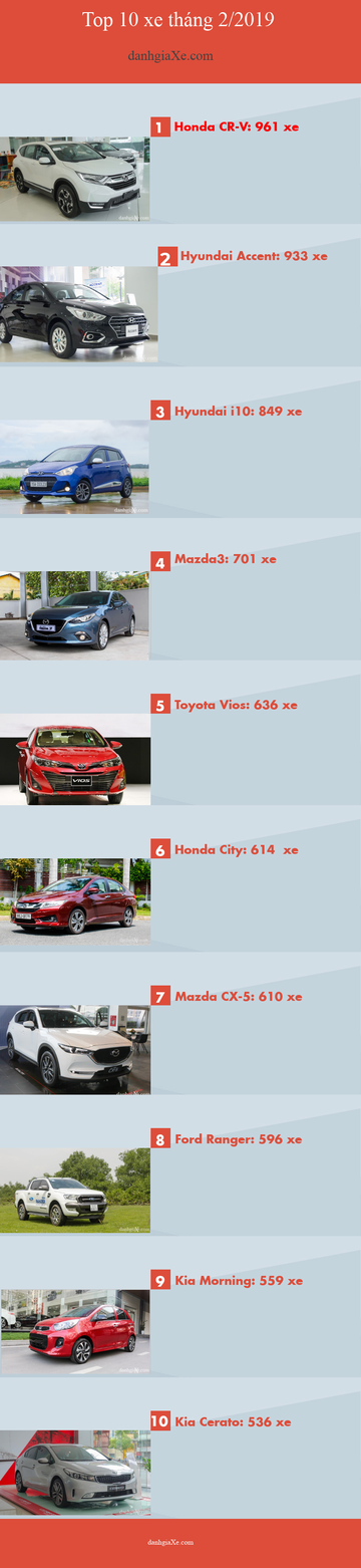 - Top 10 ôtô bán chạy nhất tháng 2/2019: Honda CR-V tiếp tục giữ ngôi vương