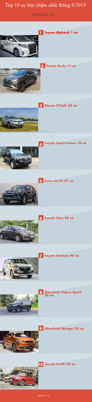 Tương tự như tháng trước, chiếm đa số trong danh sách Top 10 xe bán chậm nhất tháng 4/2019 vẫn là những cái tên đến từ Toyota, và đều là những mẫu nhập khẩu. Ngoài ra còn có 2 thương hiệu đồng hương khác là Mitsubishi và Suzuki.