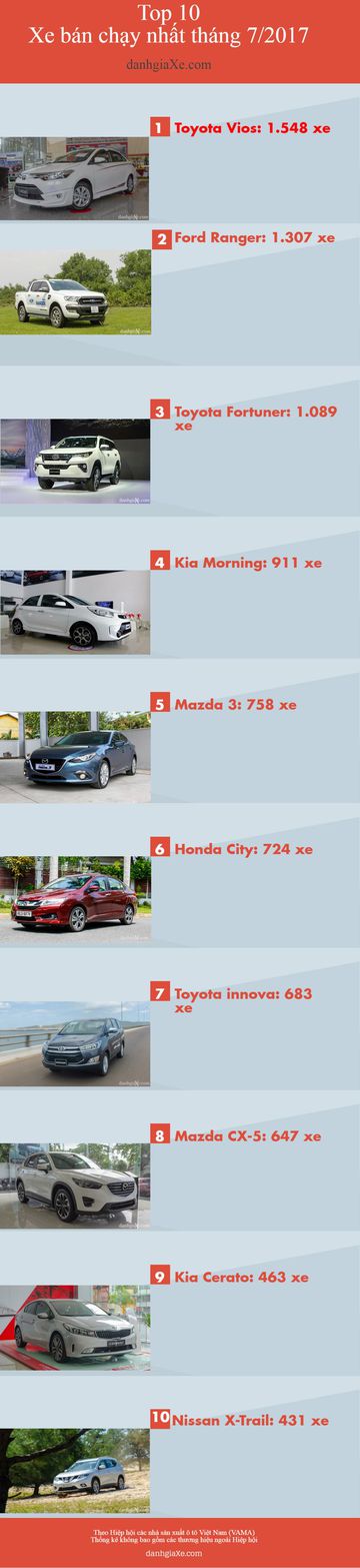 Mặc dù doanh số trong tháng 7 bị giảm tới 1.133 xe so với tháng trước nhưng Toyota Vios vẫn chễm chệ trên vị trí ngôi đầu bảng xếp hạng. Tiếp theo đó là những cái tên quen thuộc như Ford Ranger, Toyota Fortuner, Kia Morning.