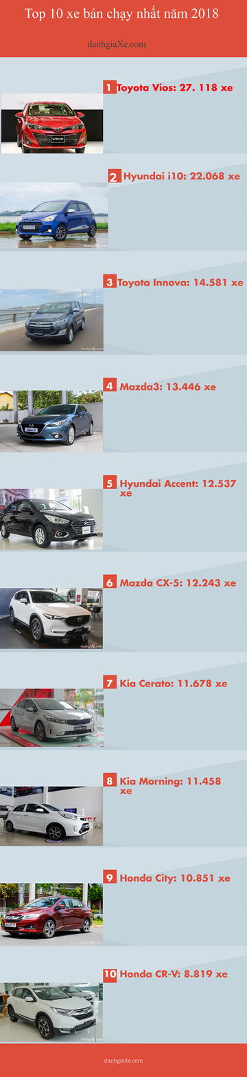Diễn biến đáng quan tâm tiếp theo trong bảng xếp hạng năm nay là sự hoán đổi ngôi vị của Toyota Vios và Hyundai i10. Nhiều năm trước, Hyundai i10 luôn là mẫu xe có doanh số cao nhất trong năm, sau đó mới tới mẫu sedan hạng B của Toyota. Tuy nhiên năm nay, tình thế đã thay đổi khi Vios tạo khoảng cách lên tới 5.050 chiếc so với Hyundai i10. Dưới đây là chi tiết bảng xếp hạng 10 xe bán chạy nhất trong năm 2018