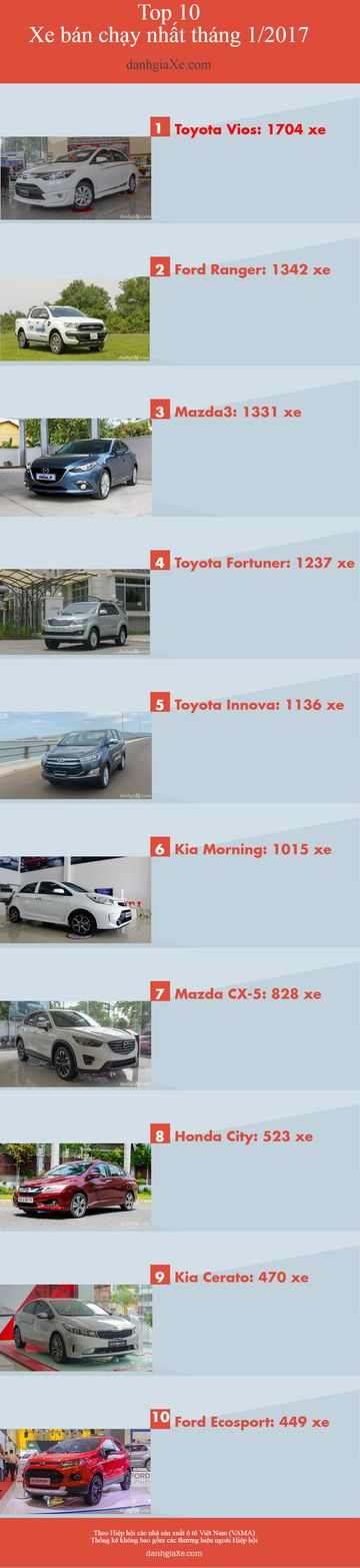 Top 10 xe bán chạy nhất tháng 1/2017: Ford Ranger lấy lại phong độ