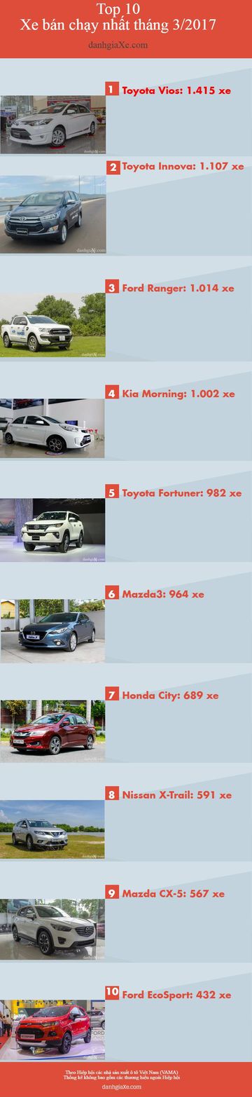 Dưới đây là Top 10 xe có doanh số cao nhất trong tháng 3/2017: