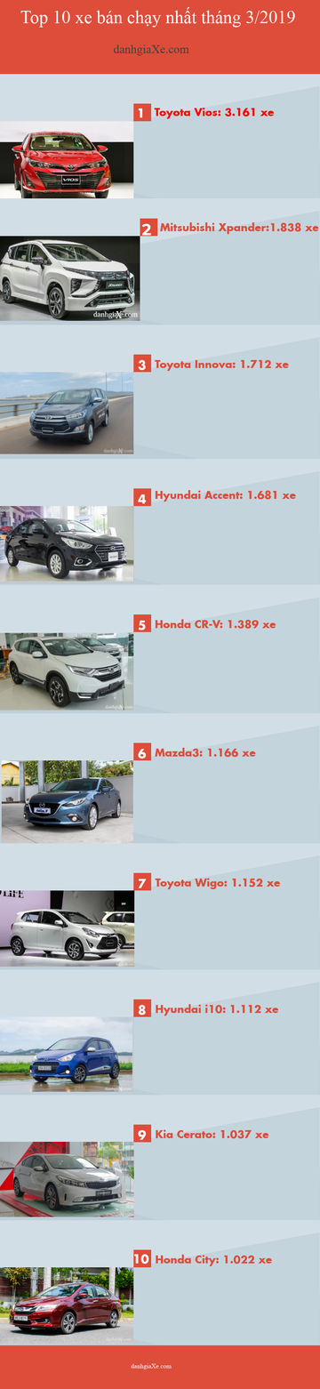 Top 10 xe bán chạy nhất tháng 3/2019: Vios lấy lại ngôi vương