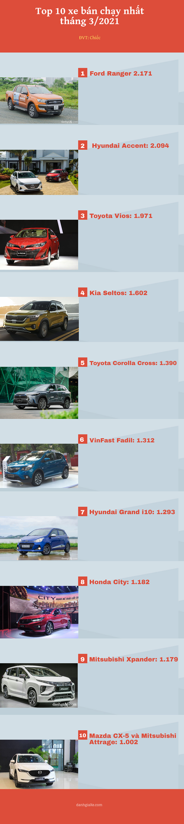 Top 10 xe bán chạy nhất tháng 3/2021: Ford Ranger dẫn đầu