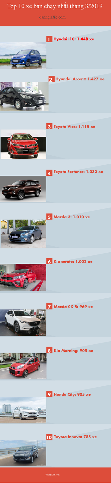 - Top 10 xe bán chạy nhất tháng 4/2019: Vios bị phế vị, đứng sau cả Accent