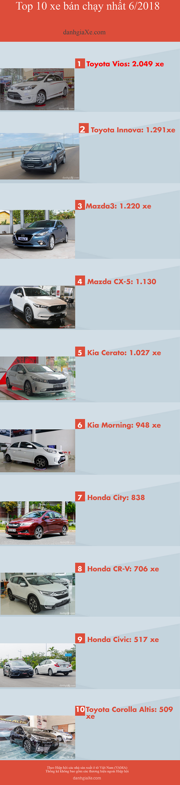 Top 10 xe bán chạy nhất tháng 6/2018: Honda Civic lần đầu lọt Top