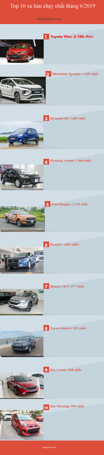 Với doanh số đạt 3.106 xe bán ra trong tháng 6, Toyota Vios bỏ xa tất cả các mẫu còn lại trong bảng xếp hạng, thậm chí gần gấp đôi so với Mitsubishi Xpander ở vị trí thứ 2.
