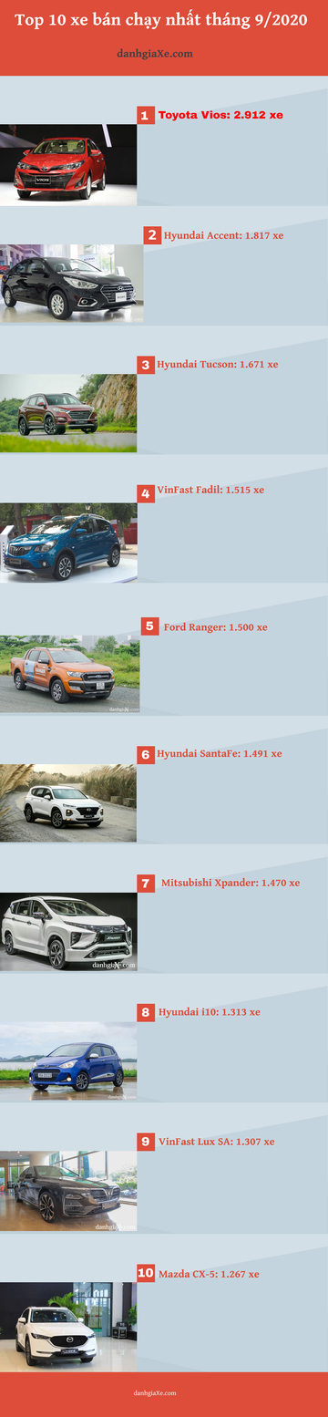 Trong tháng 9 có tới 4 vị trí trong Top 10 thuộc về Hyundai, Toyota vẫn chiếm ngôi đầu bảng bởi Vios nhưng cũng chỉ còn duy nhất một đại diện; VinFast có Fadil và Lux SA, 3 vị trí còn lại chia đều cho Mitsubishi, Ford và Mazda.