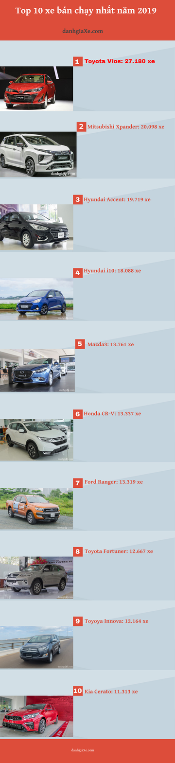 Top 10 xe bán nhiều nhất năm 2019: Xpander lật đổ Innova, vượt qua i10