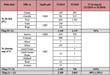 Công ty Ô tô Toyota Việt Nam (TMV) công bố tổng doanh số bán hàng các mẫu xe Toyota trong tháng 2/2019 đạt 2.300 xe (không bao gồm xe Lexus), giảm 20% so với cùng kỳ năm ngoái, thị phần của TMV trong tổng thị trường VAMA giảm 5% so với năm 2018. Tuy nhiên, các mẫu xe Vios, Innova và Fortuner vẫn tiếp tục nằm trong top 10 các mẫu xe bán chạy nhất của VAMA.
