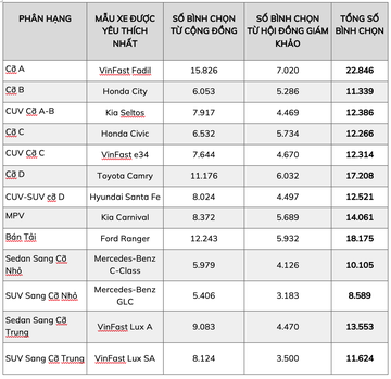 Xe được yêu thích nhất phân khúc là xe có có tổng số phiếu bình chọn của Cộng đồng và Hội đồng Giám khảo cao nhất phân khúc đó. Nếu trong 1 phân khúc có nhiều xe có tổng số phiếu bình chọn bằng nhau, xe nào có số phiếu bình chọn quy đổi của Hội đồng Giám khảo cao hơn sẽ được xếp cao hơn.
