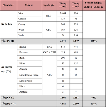 Công ty Ô tô Toyota Việt Nam (TMV) công bố tổng doanh số bán hàng trong tháng 02/2020 là 4.682 xe (không bao gồm xe Lexus), tăng 104% so với cùng kỳ năm ngoái. Tháng này mẫu xe Vios có doanh số đứng đầu thị trường. Cùng với đó Innova và Fortuner cũng có tên trong top các mẫu xe bán chạy nhất.