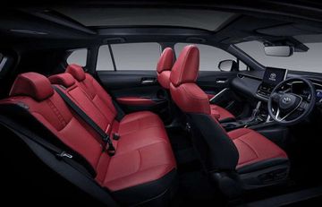 Ghế ngồi trên Corolla Cross được bọc da màu đen hoặc đỏ. Xe sử dụng hệ thống chiếu sáng bằng đèn LED. Trên 2 bản cao nhất sẽ có tính năng sạc không dây và cửa sổ trời toàn cảnh.