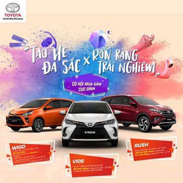 Ngoài ra, từ ngày 03/05, tại các đại lý Toyota trên toàn quốc diễn ra hoạt động chào hè “Tạo hè đa sắc, Rộn ràng trải nghiệm”, khách hàng sẽ có cơ hội trải nghiệm những mẫu xe mới của Toyota như Vios, Rush, Wigo cùng nhiều chương trình và quà tặng hấp dẫn.