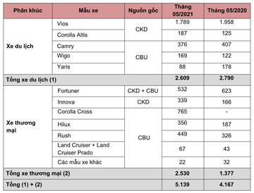 Tháng 05/2021, doanh số xe lắp ráp trong nước của Toyota đạt 2.781 xe, chiếm 54% doanh số Toyota Việt Nam. Doanh số các mẫu xe nhập khẩu đạt 2.358 xe.