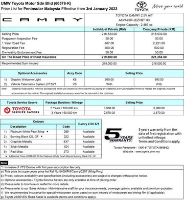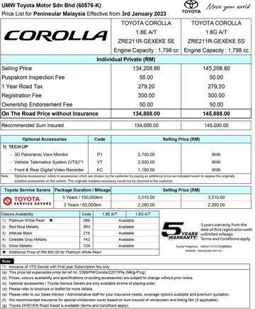 Kể từ ngày 3 tháng 1 năm 2023, hai mẫu xe của Toyota bao gồm Corolla và Camry tại Malaysia sẽ được điều chỉnh về giá bởi UMW Toyota Motor (UMWT).