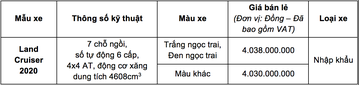 Chi tiết mức giá bán lẻ Land Cruiser 2020 như sau: